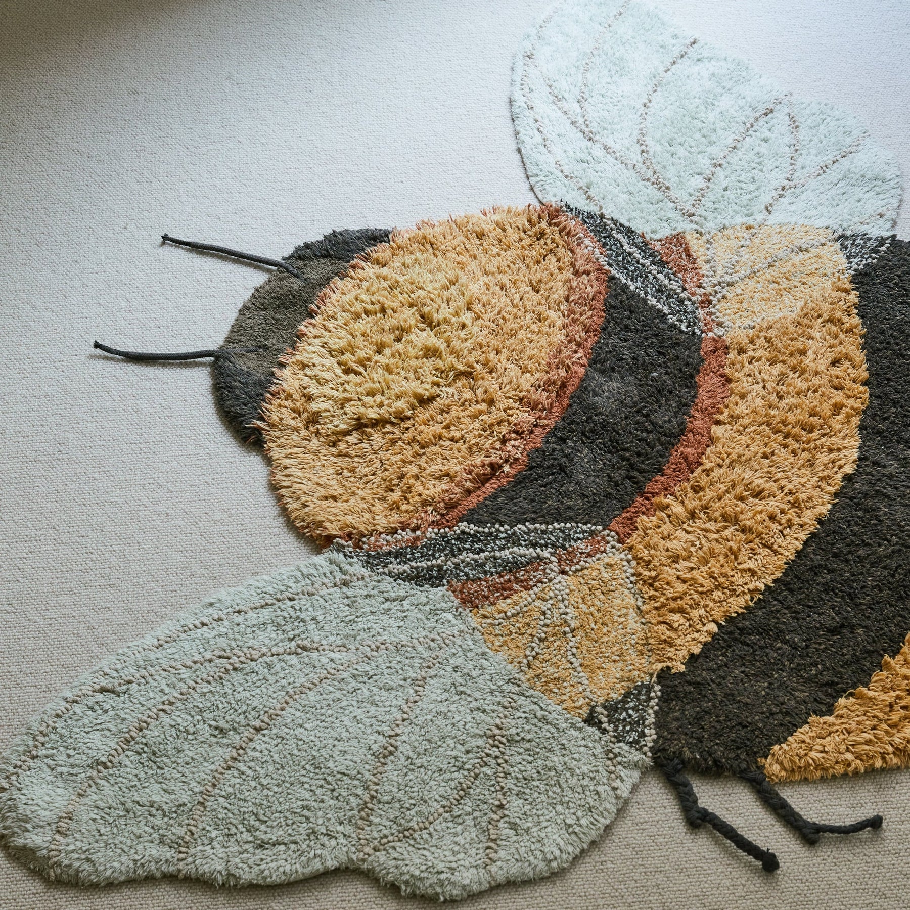 Turn the little ones' room into a world of play and learning with this Bee rug! This rug isn't just fun; it's the perfect companion for exploring the fascinating world of bees and their crucial role on our planet. A bee silhouette rug, with wings and its striped body in honey and dark grey colors, will become the new friend for your little one's room. Part of the bee is extra fluffy with a longer pile, and it’s finished with dark grey cords as antennas and little legs