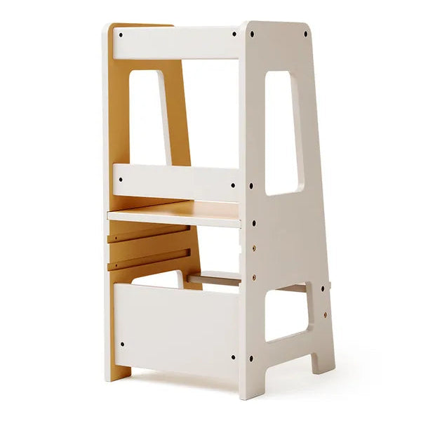 The Helping Tower also known as a learning tower or kitchen helper stool is crafted from FSC‑certified wood and designed for children aged 1 to 7 years. It should only be used once the child is steady enough to stand securely, so the minimum age varies greatly depending on the child. It features a height-adjustable standing platform with three levels, as well adjustable steps. Simply loosen the side bolts and slide the platform or base into the desired setting. At the top, two platform levels, a removable safety rail (support bar) adds extra stability and can be taken off when the child no longer needs it. Its exterior is painted soft grey, while the interior is a warm mustard yellow, creating a clean and stylish contrast. Stable and well-built, the tower brings children safely up to countertop or sink height, encouraging them to help with cooking, washing, or snack preparations and take part in family routines with genuine responsibility. Feature Highlights Adjustable platform and base: adapts from toddler to early school age with three platform heights and a movable base. Promotes real involvement: lets children safely join family tasks and learn to be independent from an early age Removable back side support bar at top levels: adds peace of mind early on, then simply detaches as your child gains confidence.