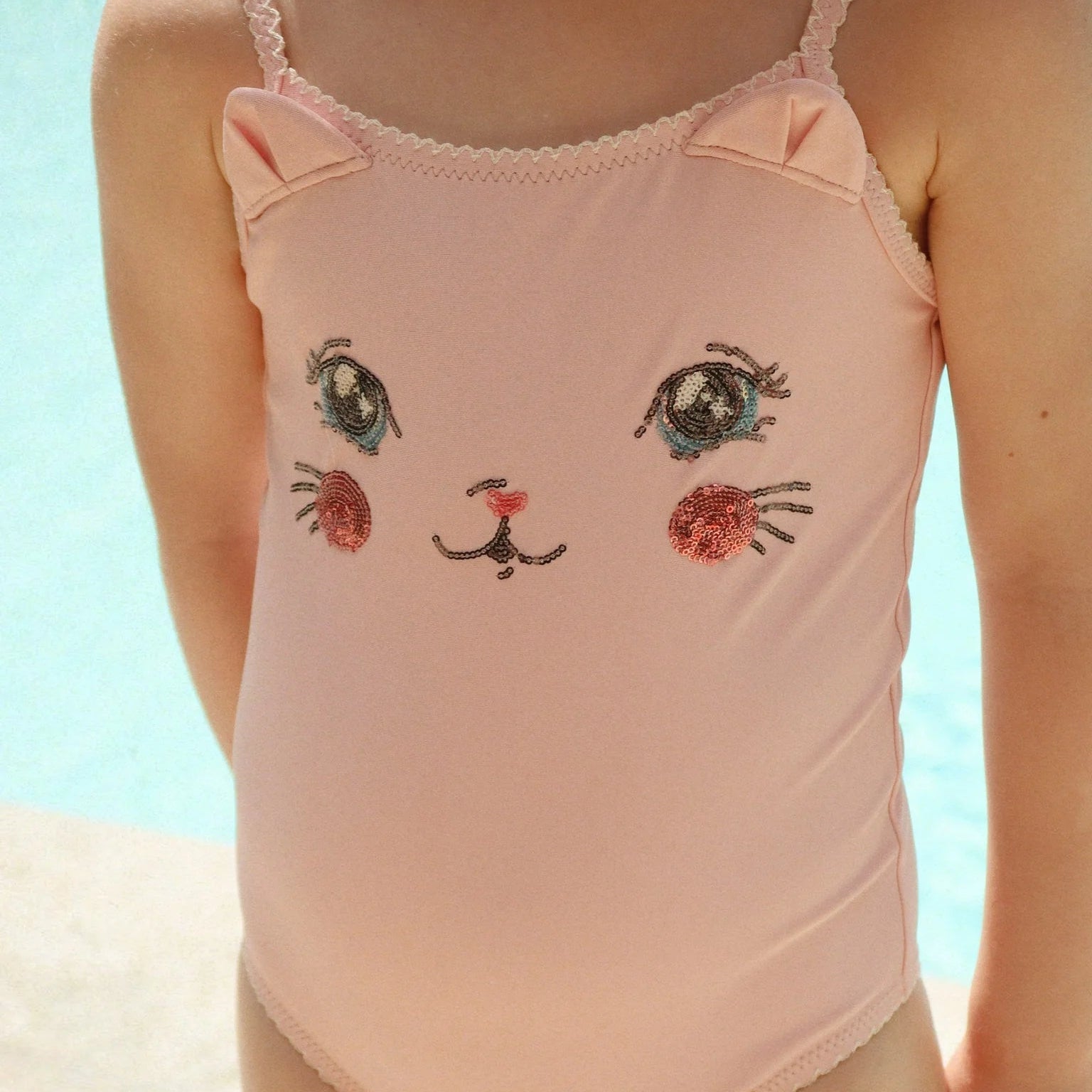 Soft swimsuit that looks as cute as a kitten with a cat face print in front. Crafted in a stretchy and quick-drying fabric, and designed with slim straps, sequins, and cute eyelet detailing along the hems.