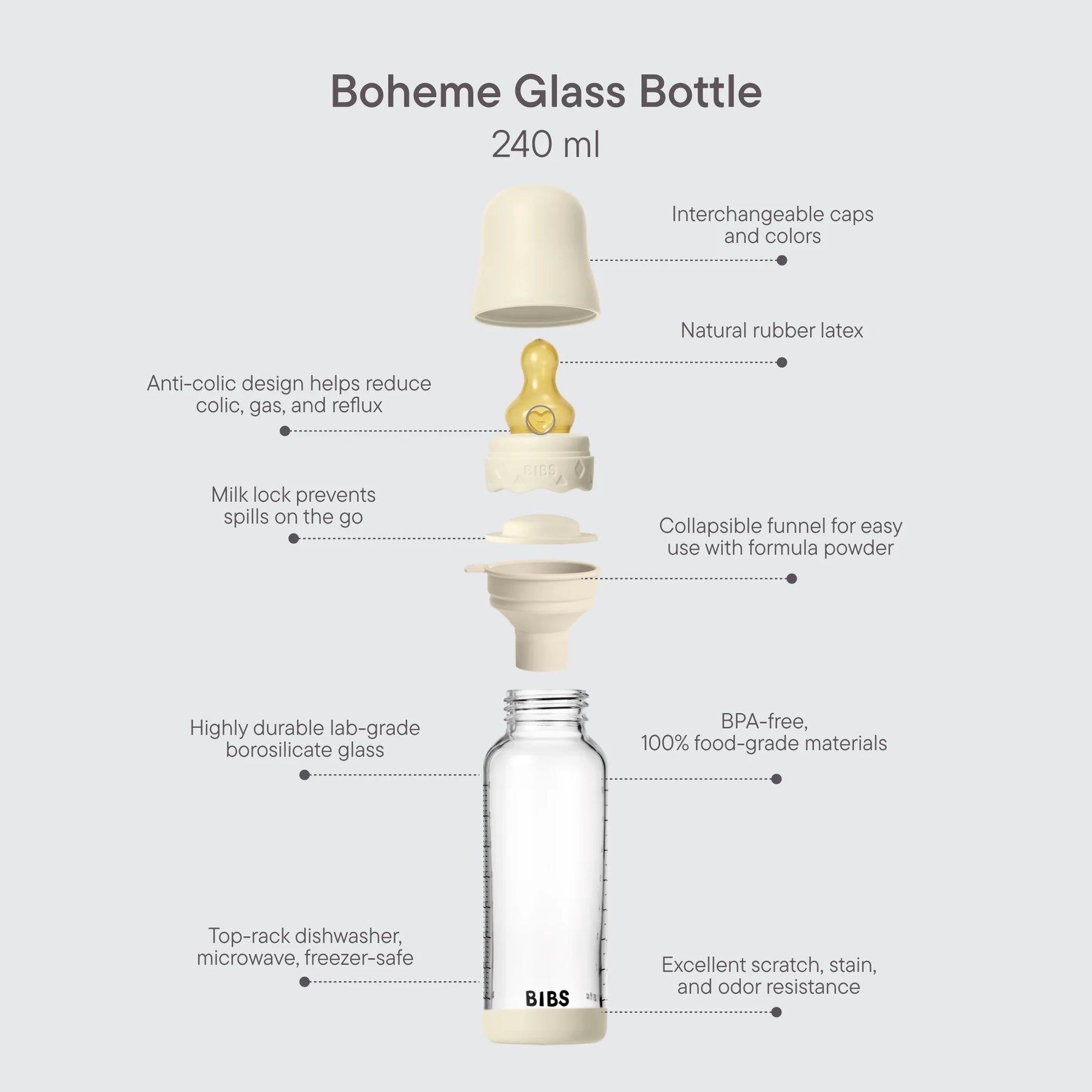 Ready to upgrade your feeding routine? BIBS’ Glass Baby Bottle offers a sleek, award-winning design with an anti-colic valve to reduce gas and reflux, and a breast-like nipple that eases the transition between breastfeeding and bottle feeding. Featuring a dishwasher-safe, durable glass base that maintains a like-new appearance over time, and spill-minimizing components for convenient feeds at home or on the go. The ultra-soft, hypoallergenic medical-grade silicone nipple is easy to sterilize, reinforced with ribbing for added durability, and includes an anti-slip texture for a secure latch. Comes with a slow-paced flow, with additional flow rates available as your baby’s feeding pace changes. BPA-free / Ages 0+