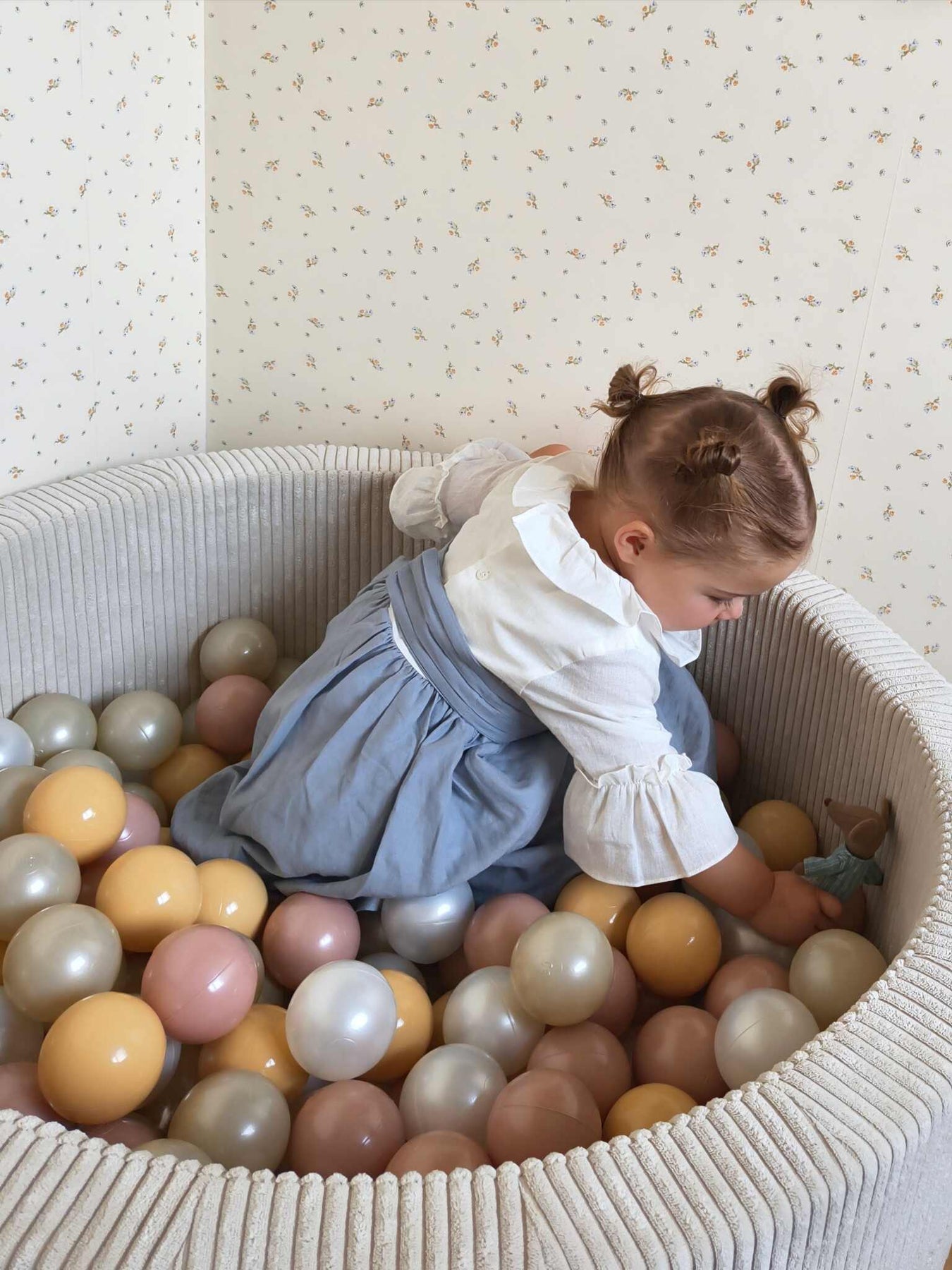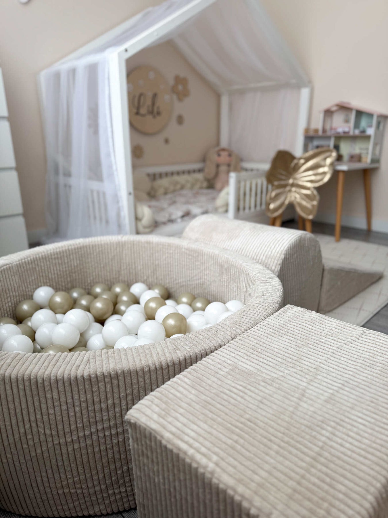 This round corduroy fabric beige ball pit measures 90x40 cm and comes with 200 balls, making it an ideal choice for young children. A ball pit provides hours of fun - kids love diving in, hiding, and playing joyfully with the balls. It’s the perfect addition to any playroom or kids' space!