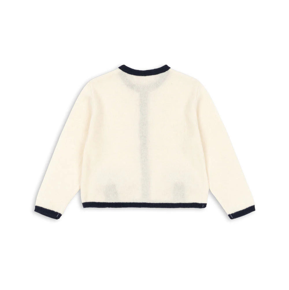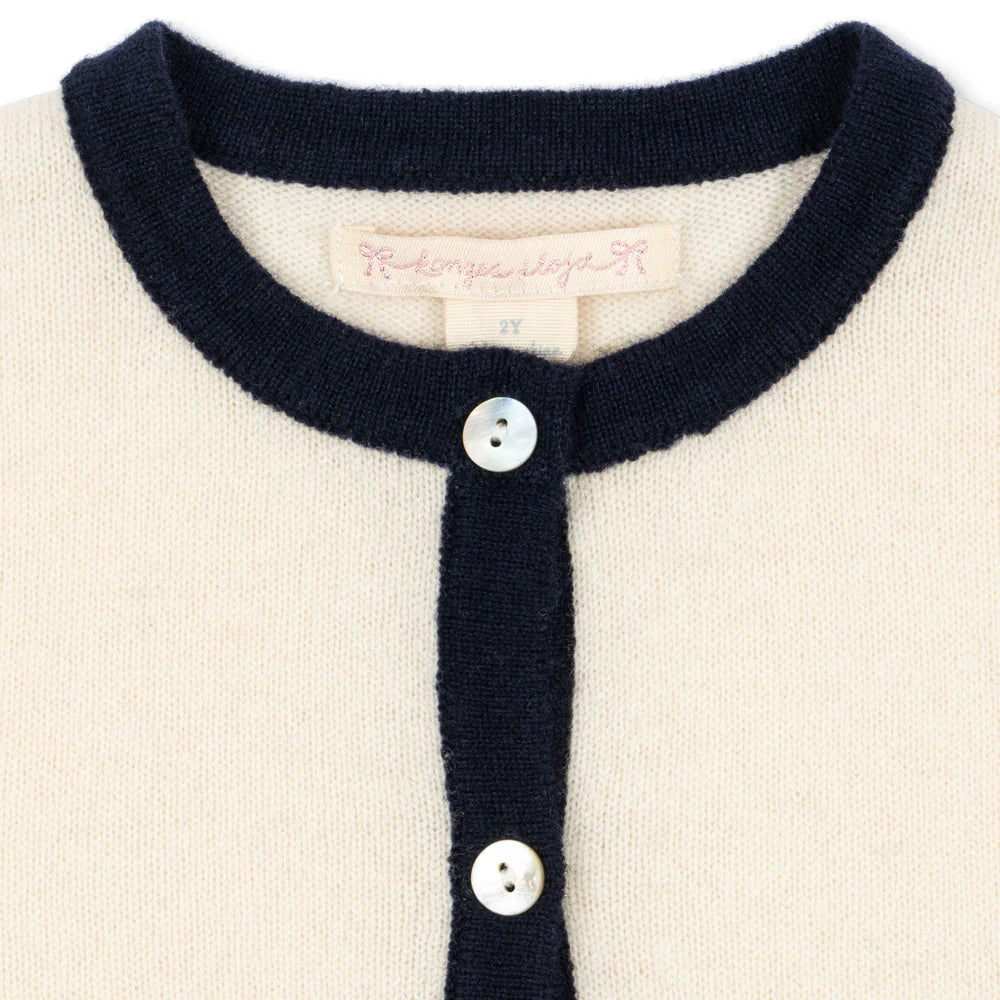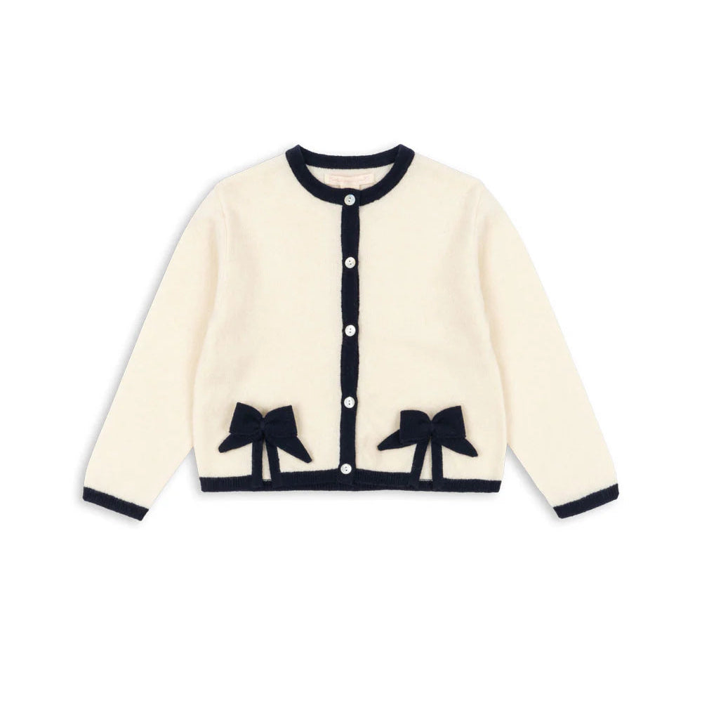 Soft 100% wool cardigan with bow detailing. Classic design with round neck, contrast edges, and mother of pearl buttons.