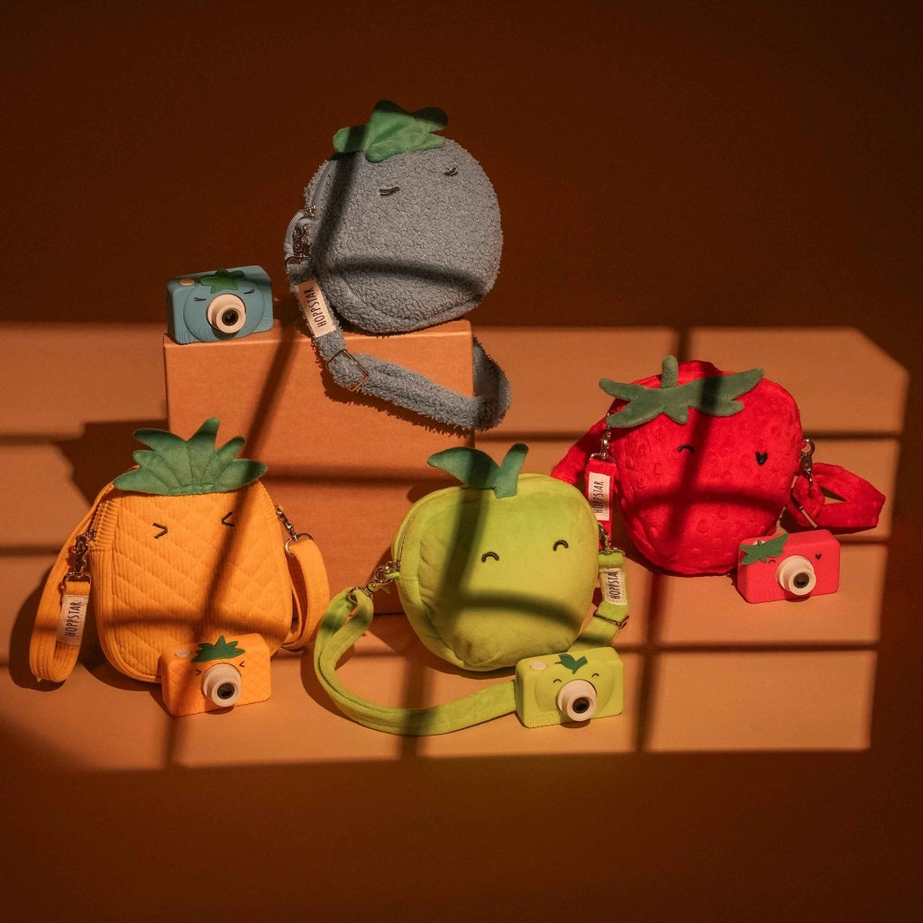 Our fun and colorful Cheeky Fruits Bags are the perfect match for our popular and colorful Cheeky Fruits cameras – Strawbella, Blubelle, Pina Coolada, and Mr. Smithy. These playful camera bags are not only eye-catching but also super practical: thanks to their clever design, they can be worn as a shoulder bag or as a backpack. They fit children of all ages and offer enough space for all Hoppstar camera models.