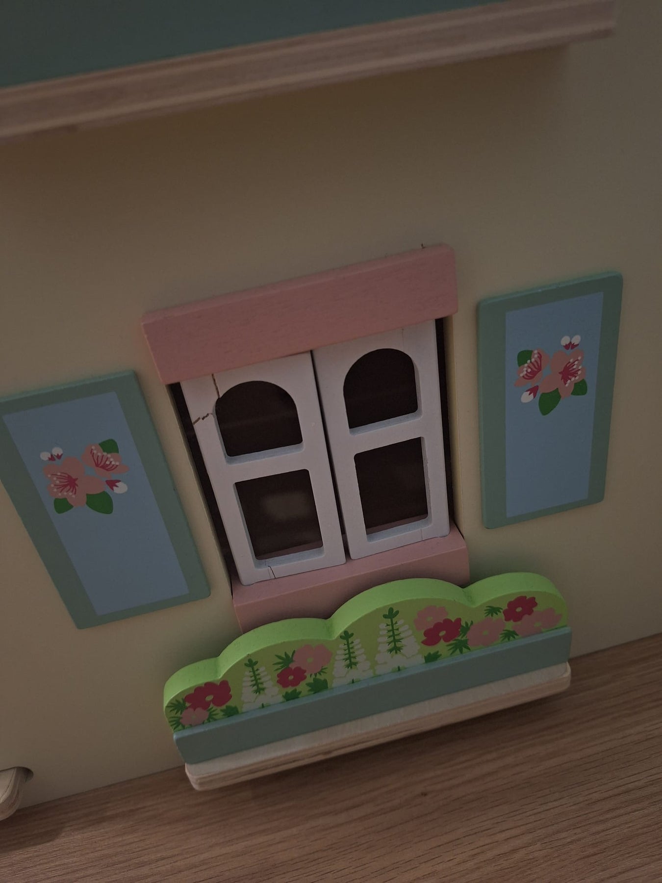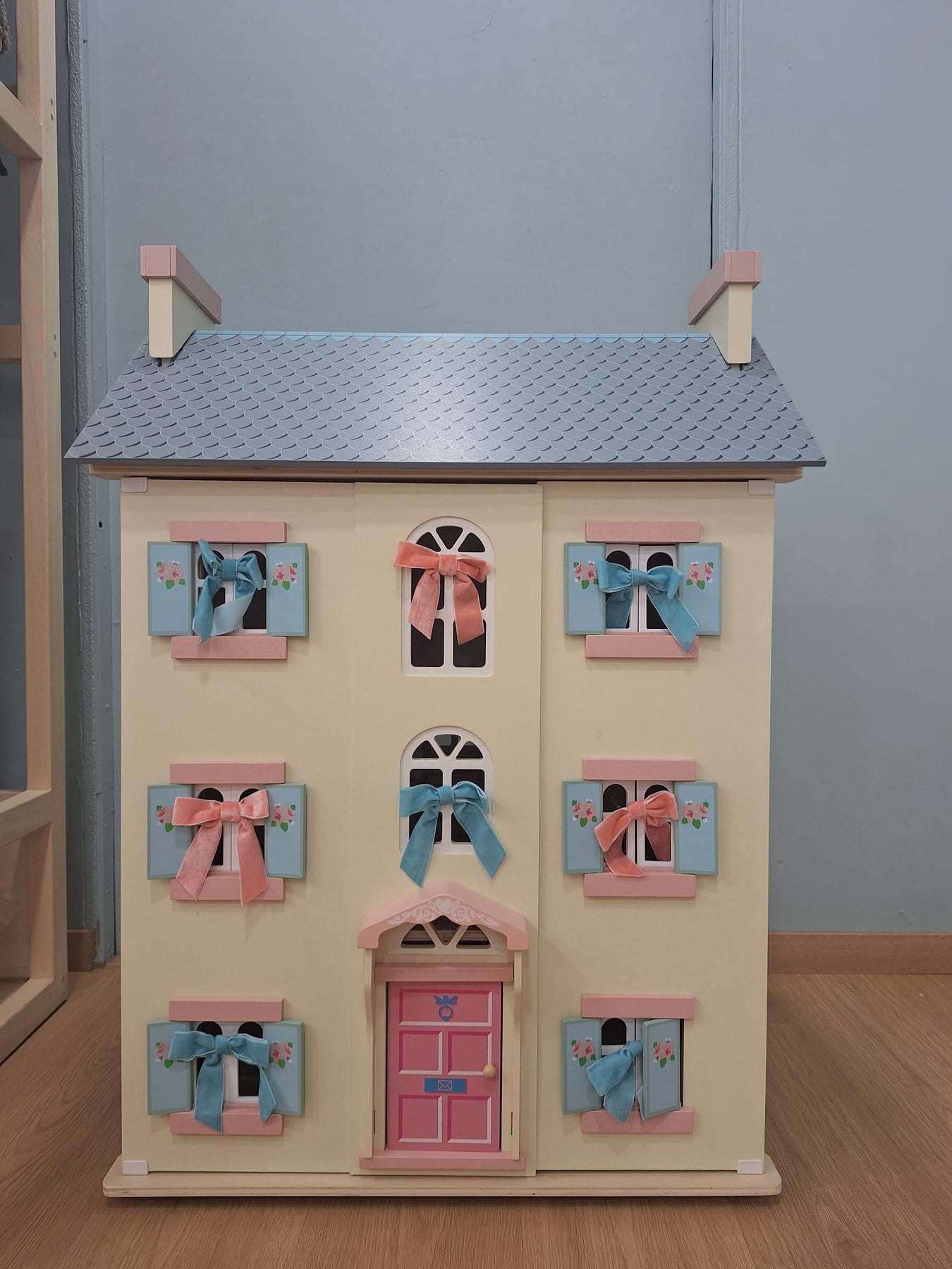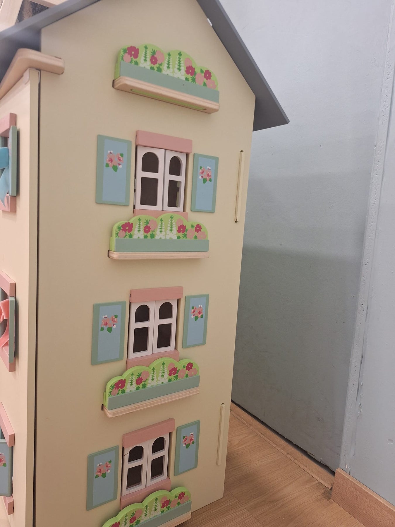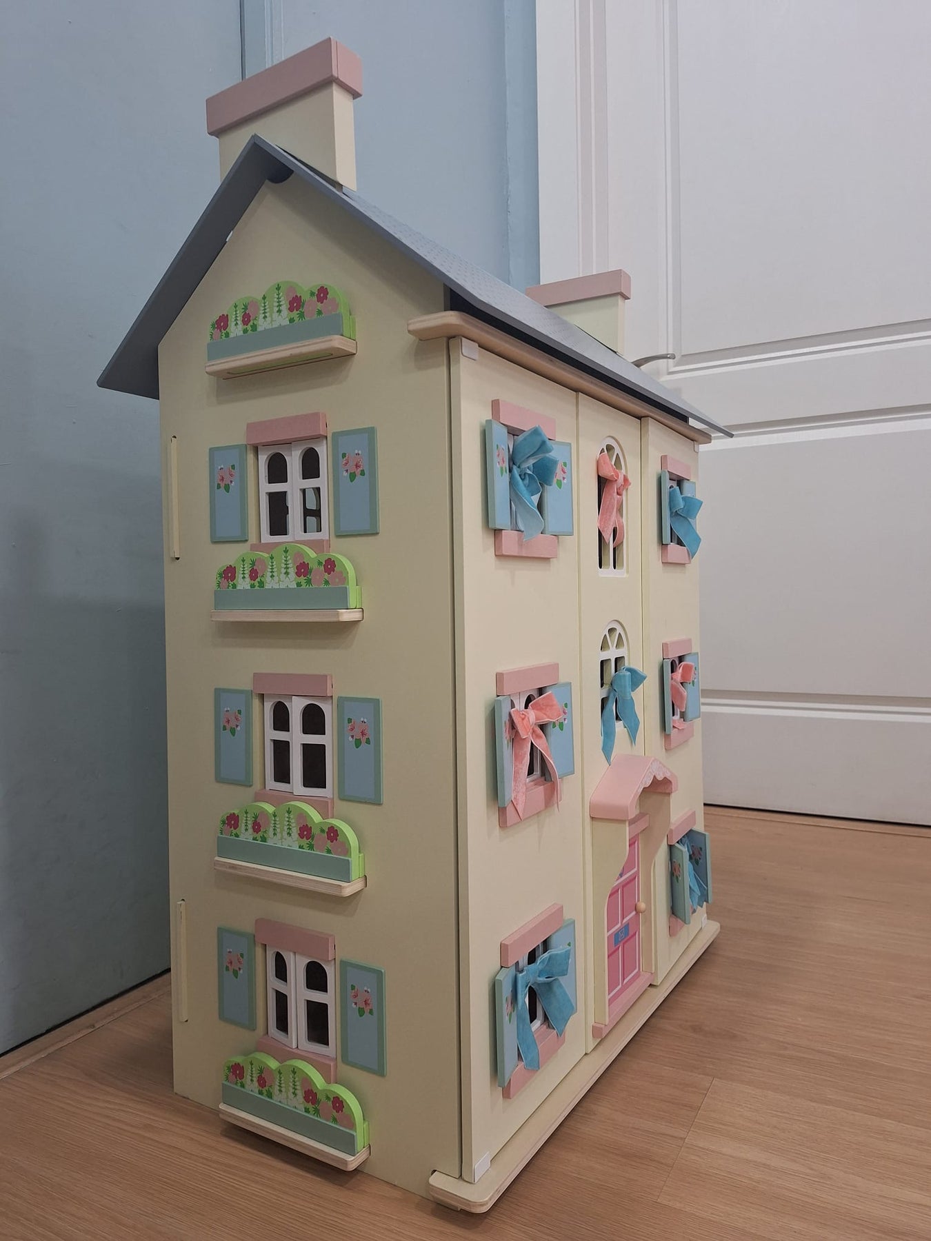 Role play fun adventures await with this simply stunning toy doll house, fitting for any miniature lord or lady. Full of exquisite details, this grandiose home is fully painted in soft creams with pink and blue accents and sweet flower motif detailing.