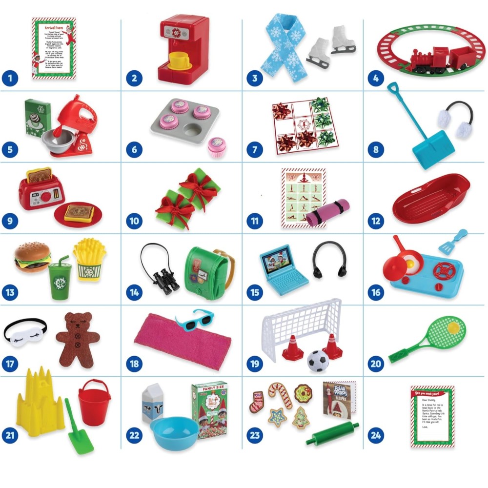 - Includes: 24 sets of elf ideas with props with more than 70 interchangeable pieces and Instructions for set up each day