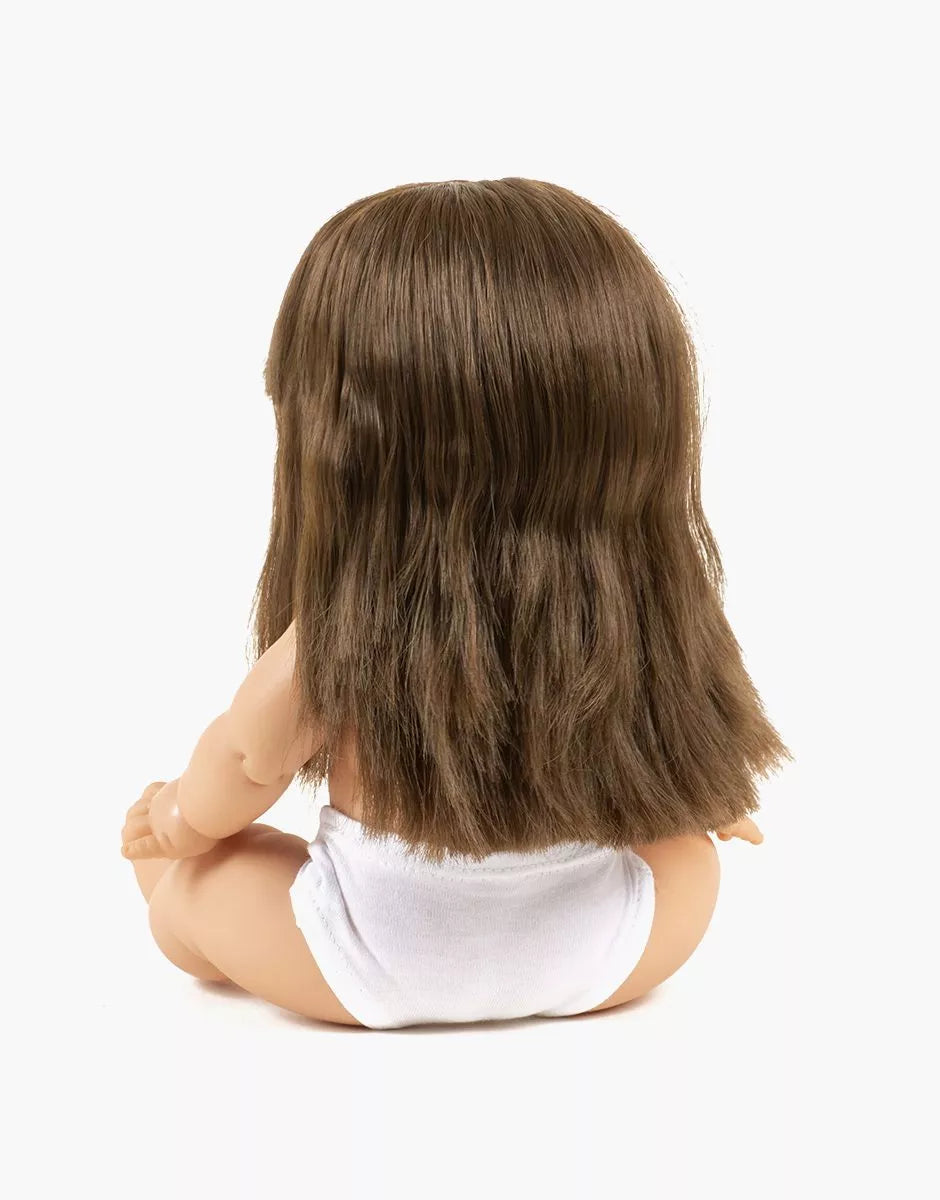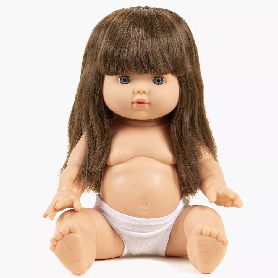 Meet Cerise, an exclusive Minikane Gordis Doll (34cm) with long brown hair styled with bangs, and blue/ grey eyes. Made from high-quality vanilla-scented vinyl, this anatomically correct doll offers a realistic and engaging play experience.
