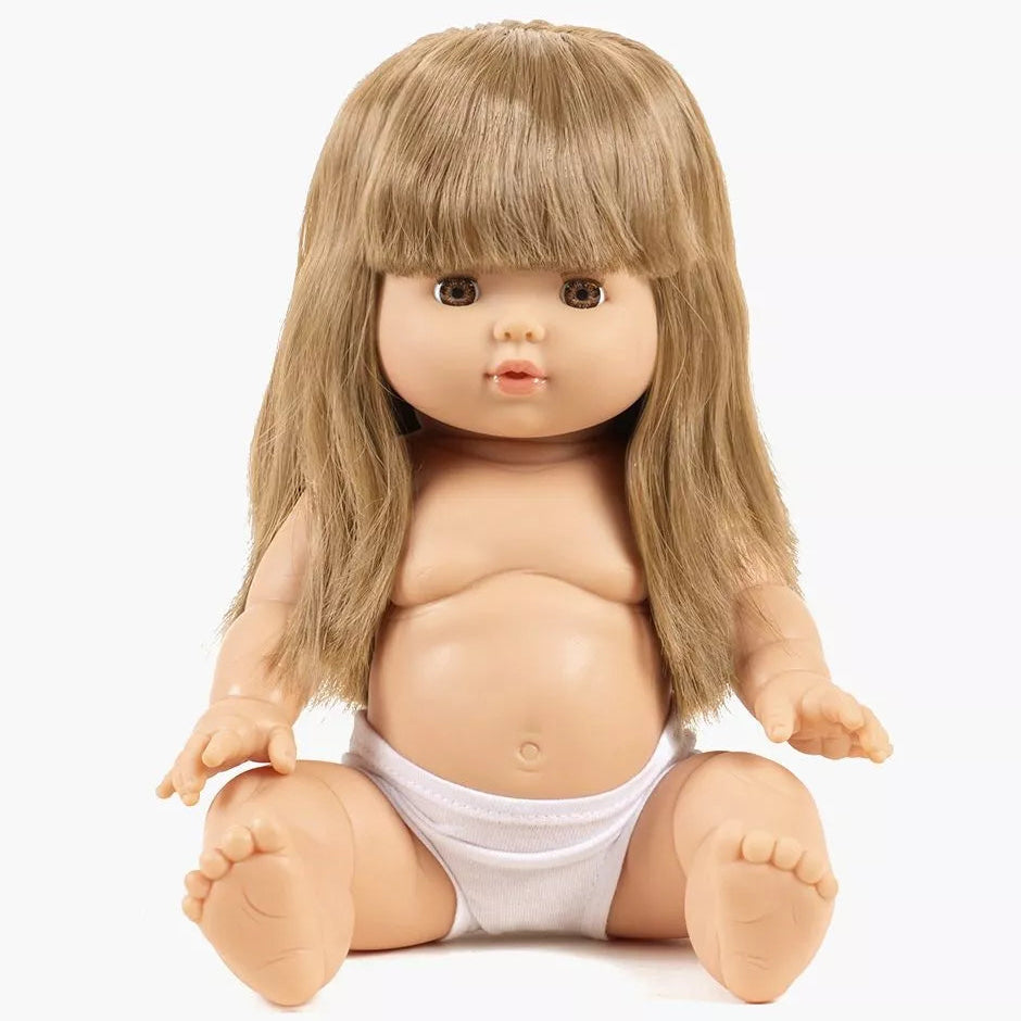 Meet Nina, an exclusive Minikane Gordis Doll (34cm) with long blonde hair styled with bangs, and brown eyes. Made from high-quality vanilla-scented vinyl, this anatomically correct doll offers a realistic and engaging play experience.