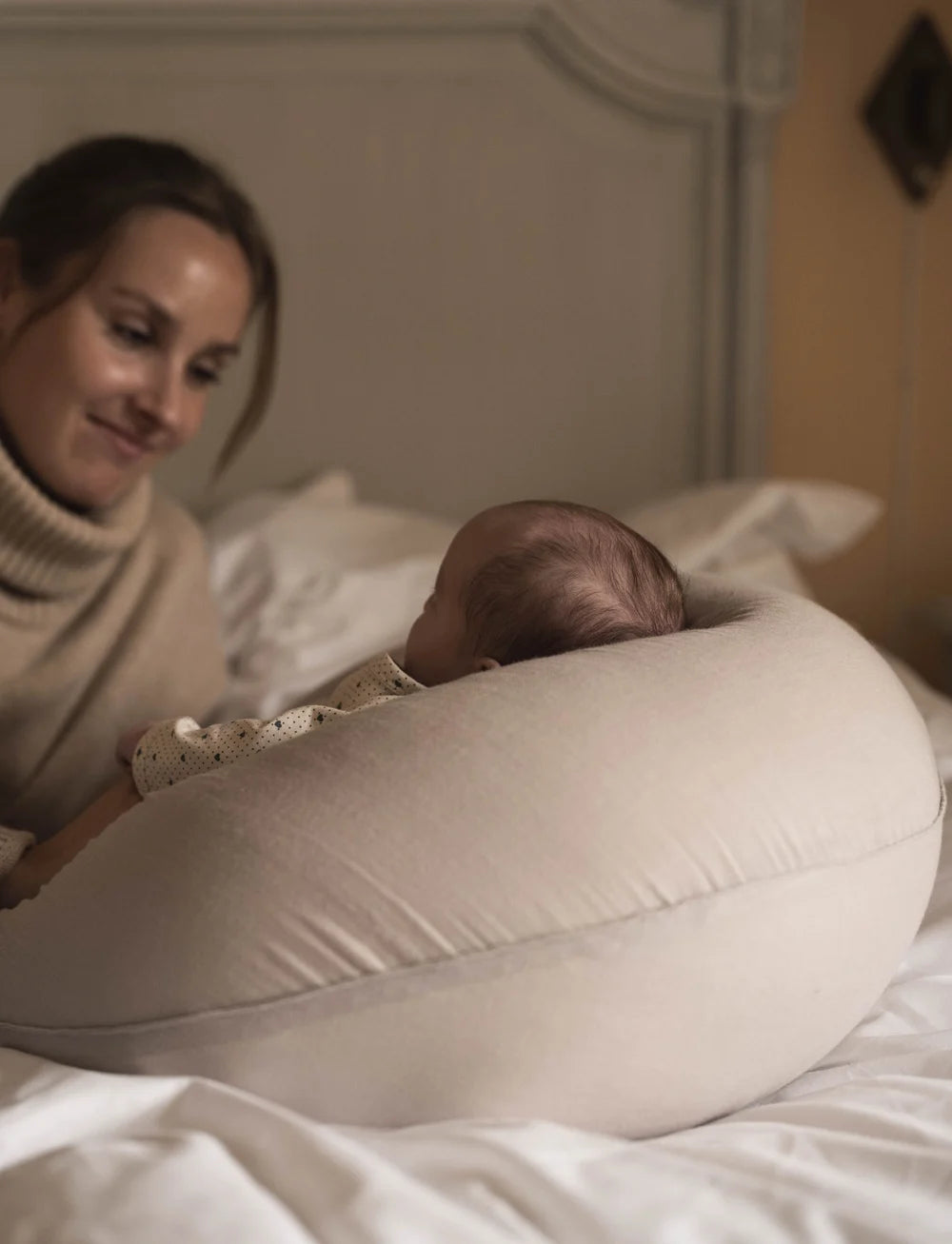 This beautiful, innovative, and multifunctional nursing pillow is designed for expectant and new parents to give them the best start to a whole new and wonderful chapter. The nursing pillow meets important needs when breastfeeding or bottle-feeding your baby. With this innovative nursing pillow, breastfeeding twins is no challenge, as it is long enough to accommodate two babies. The pillow is practical and portable and simply ties around the body. This feature makes it particularly easy when you need to get up to lift your baby from, for example, the crib to breastfeed. At each end of the nursing pillow, there is a small soft leaf attached so that the baby always has a comfort blanket at hand. In addition, it is moldable, providing comfortable support for mother and baby when breastfeeding, or as a sleeping pillow or lumbar support for pregnant women. It also provides perfect support when the baby is lying on its stomach, as a chair or neck support when the child gets bigger.