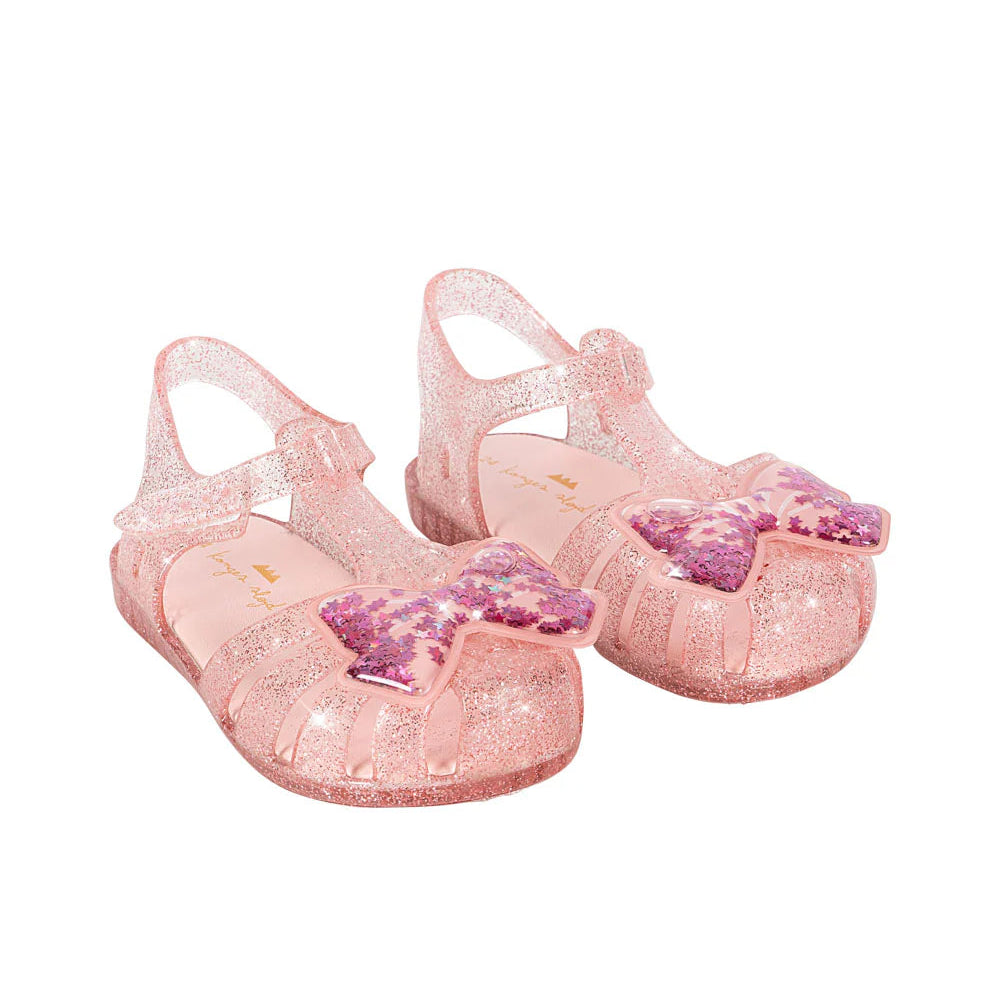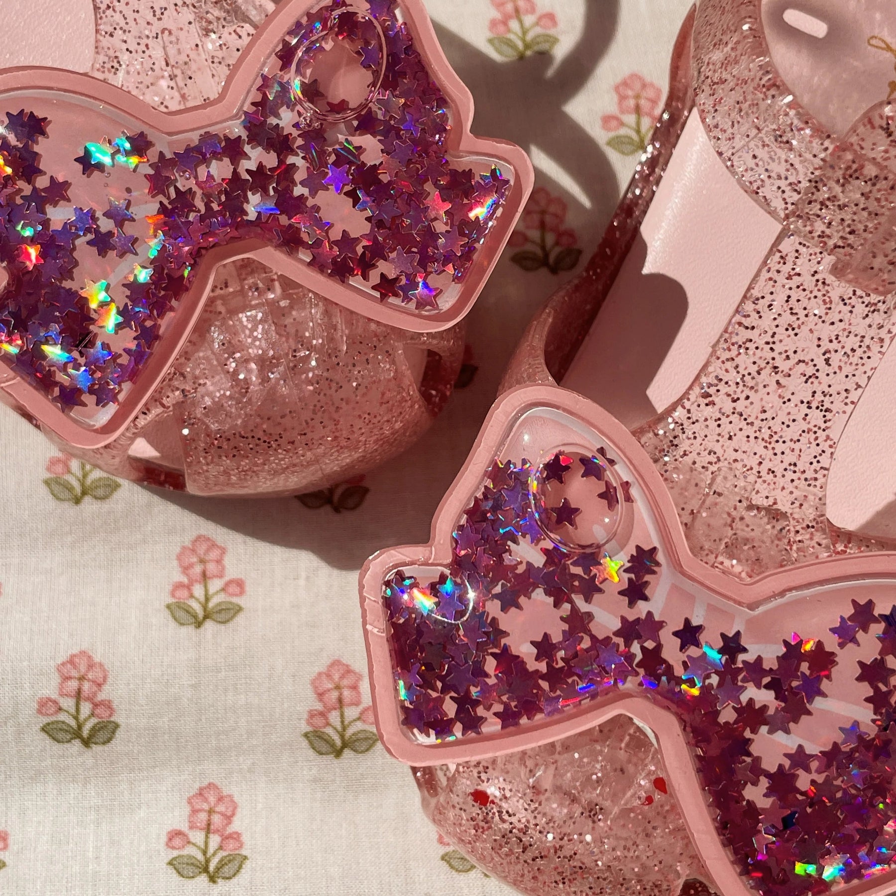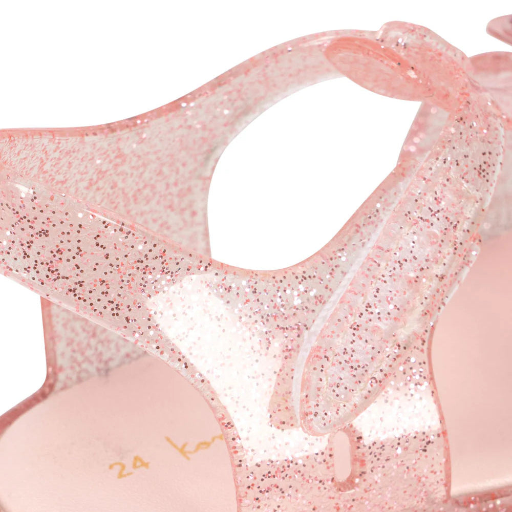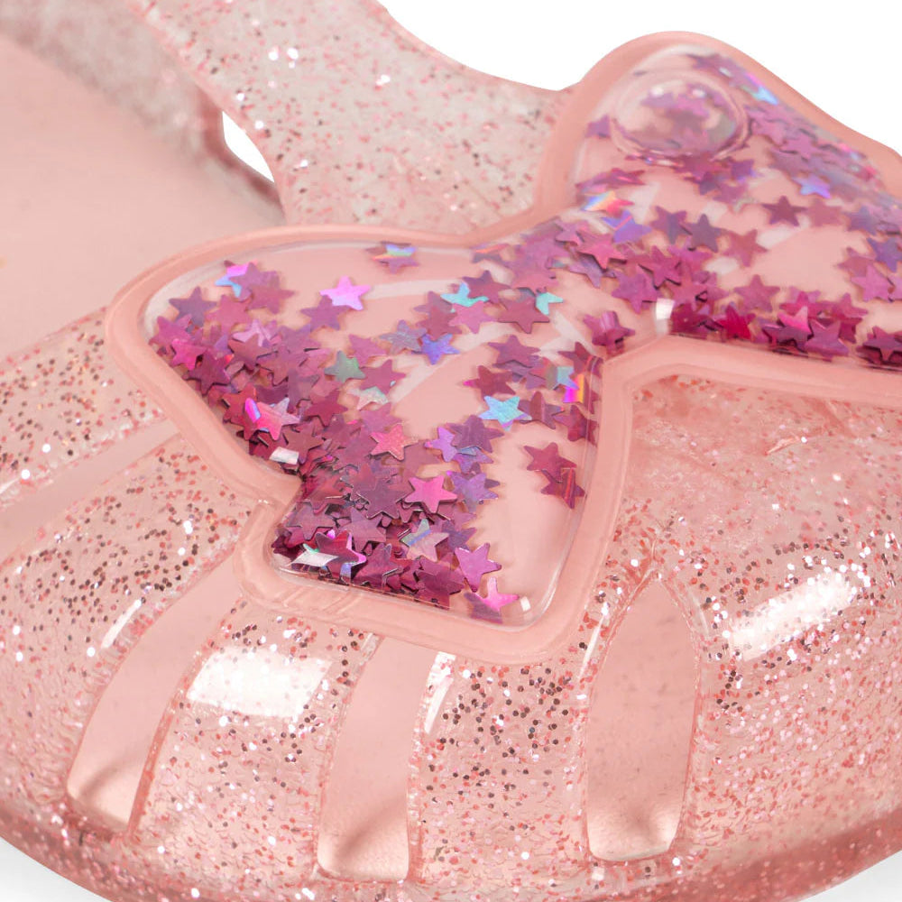 Glittery beach sandals made in PVC with a practical velcro closure that is easy for little hands to adjust. Designed with a signature Konges Sløjd bow on top - squish gently to watch the glitter dance.