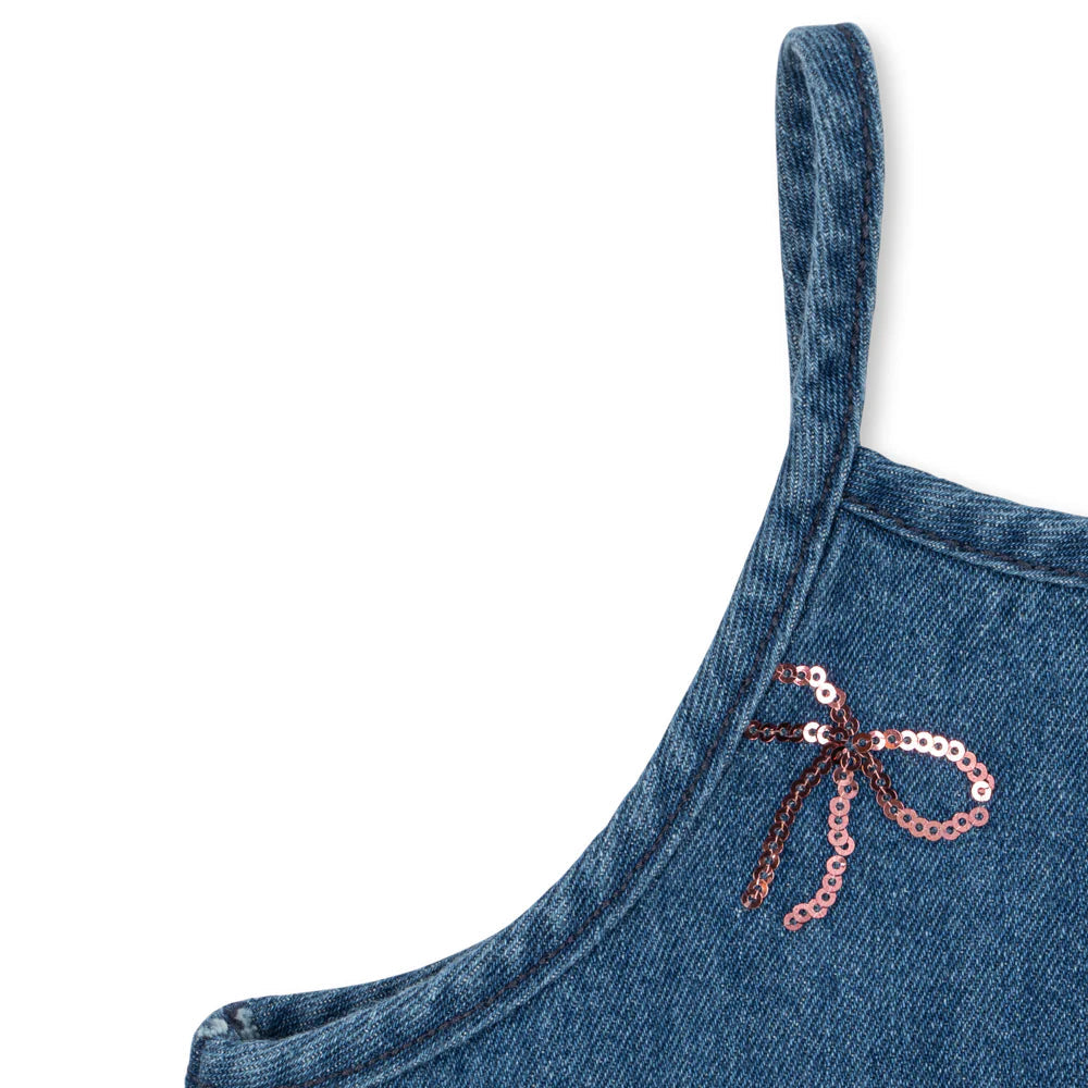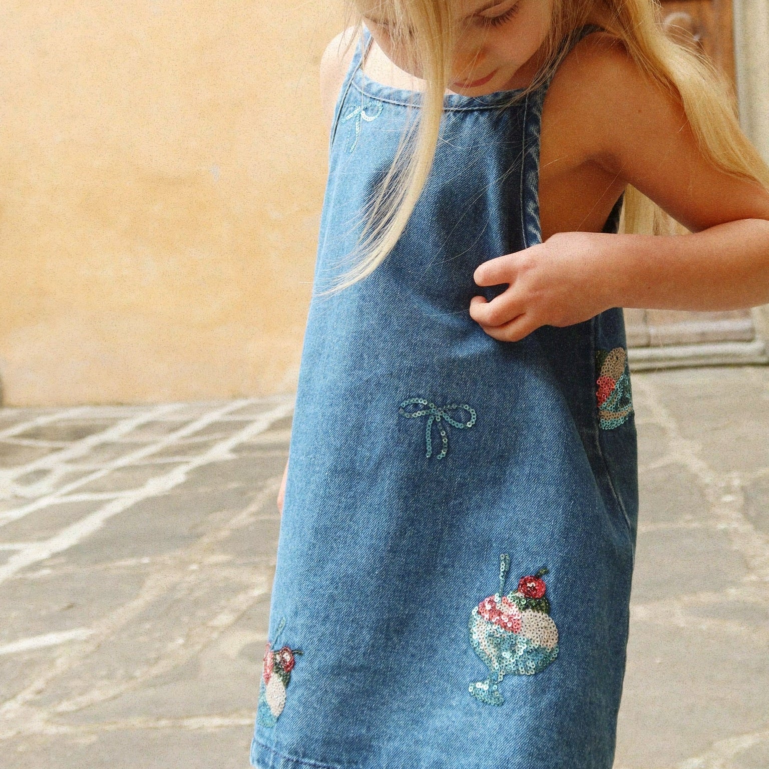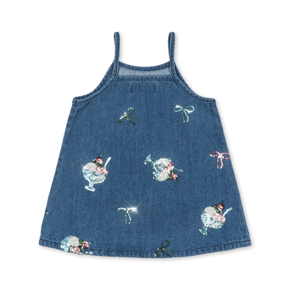 Denim strap dress with embroidered sequin ice cream desserts. Designed with a flattering straight silhouette that is perfect for wearing alone or for layering with a tee or blouse underneath.