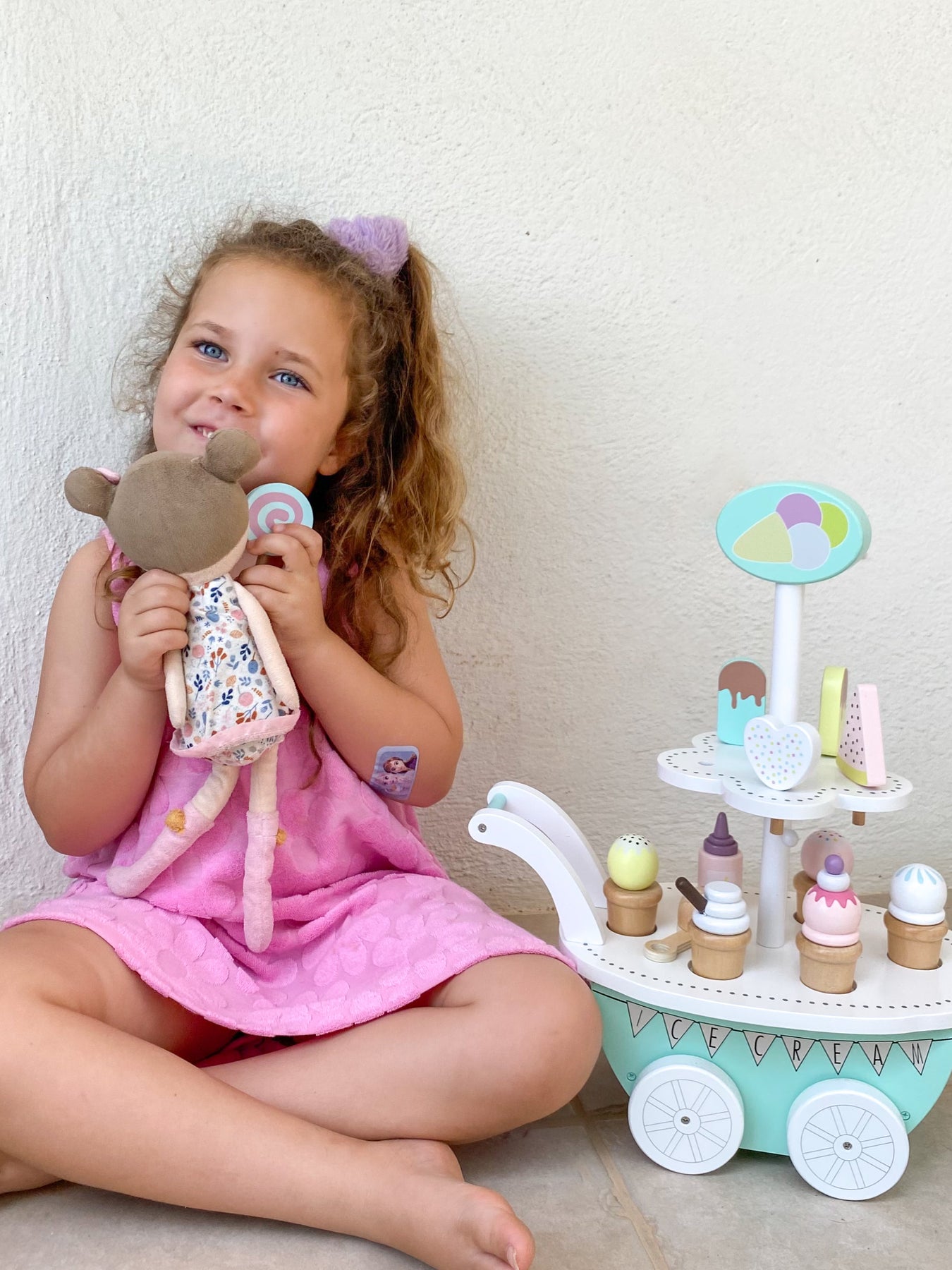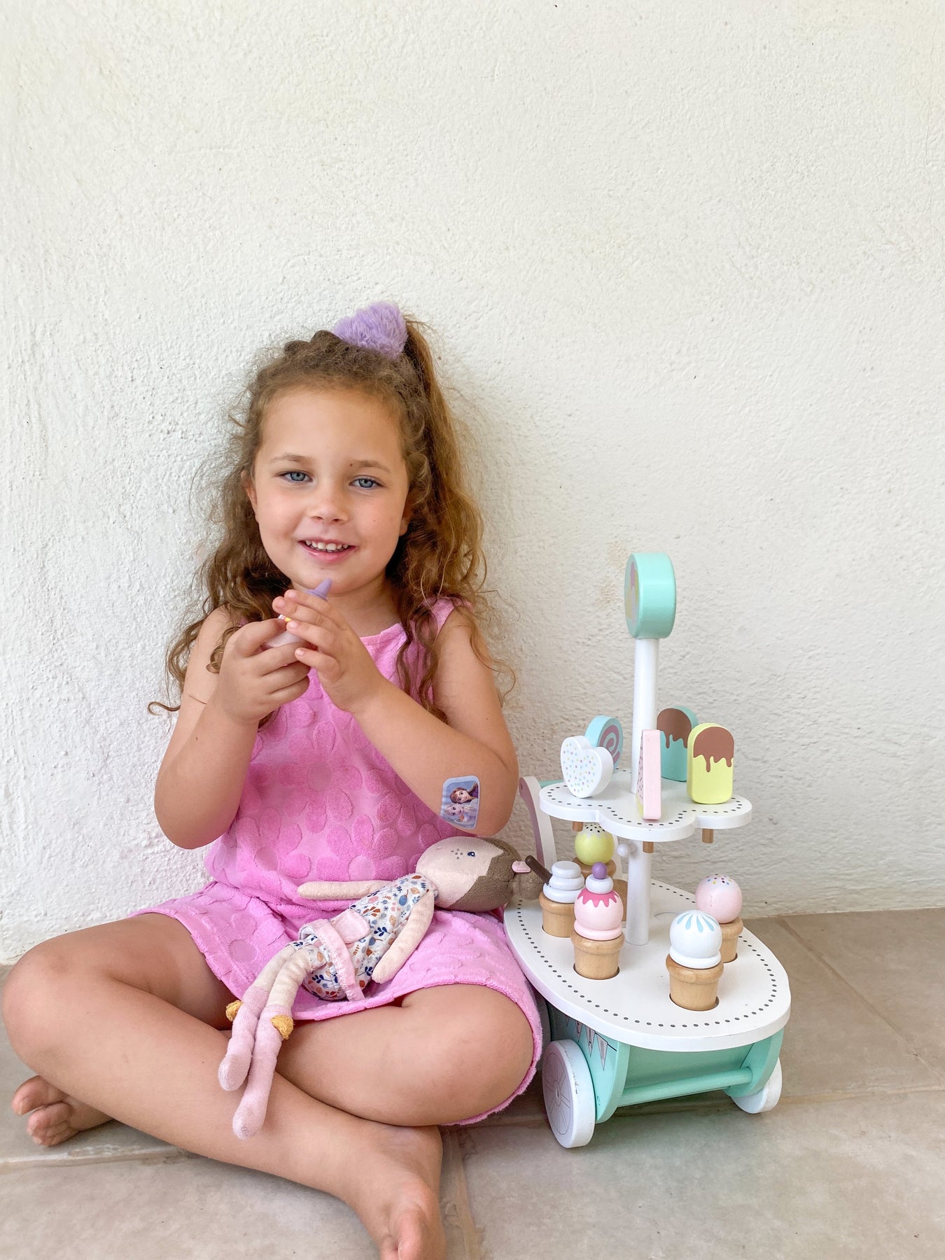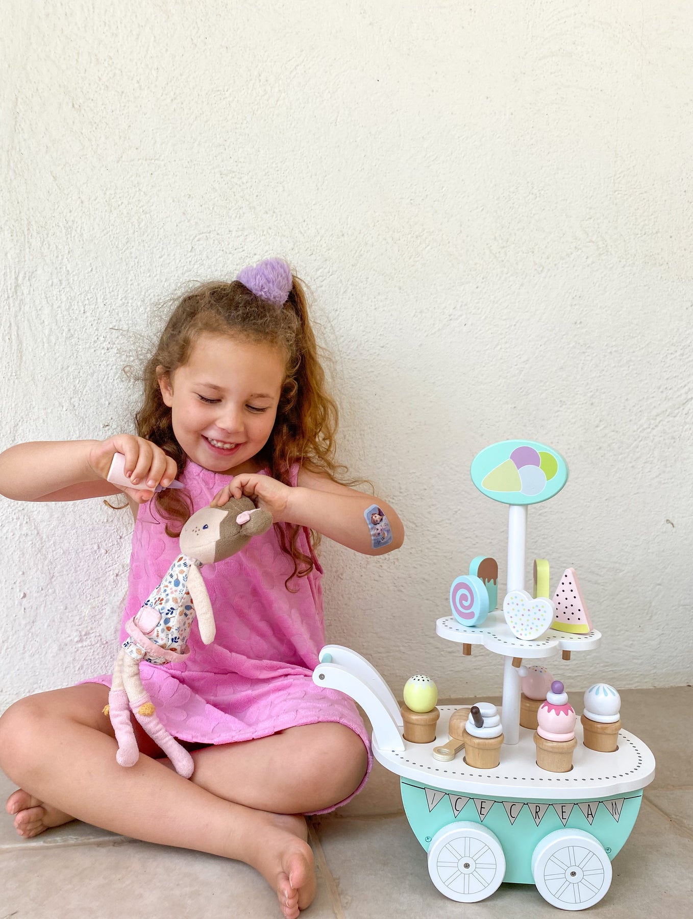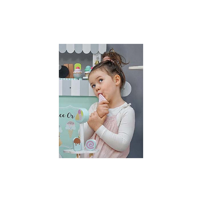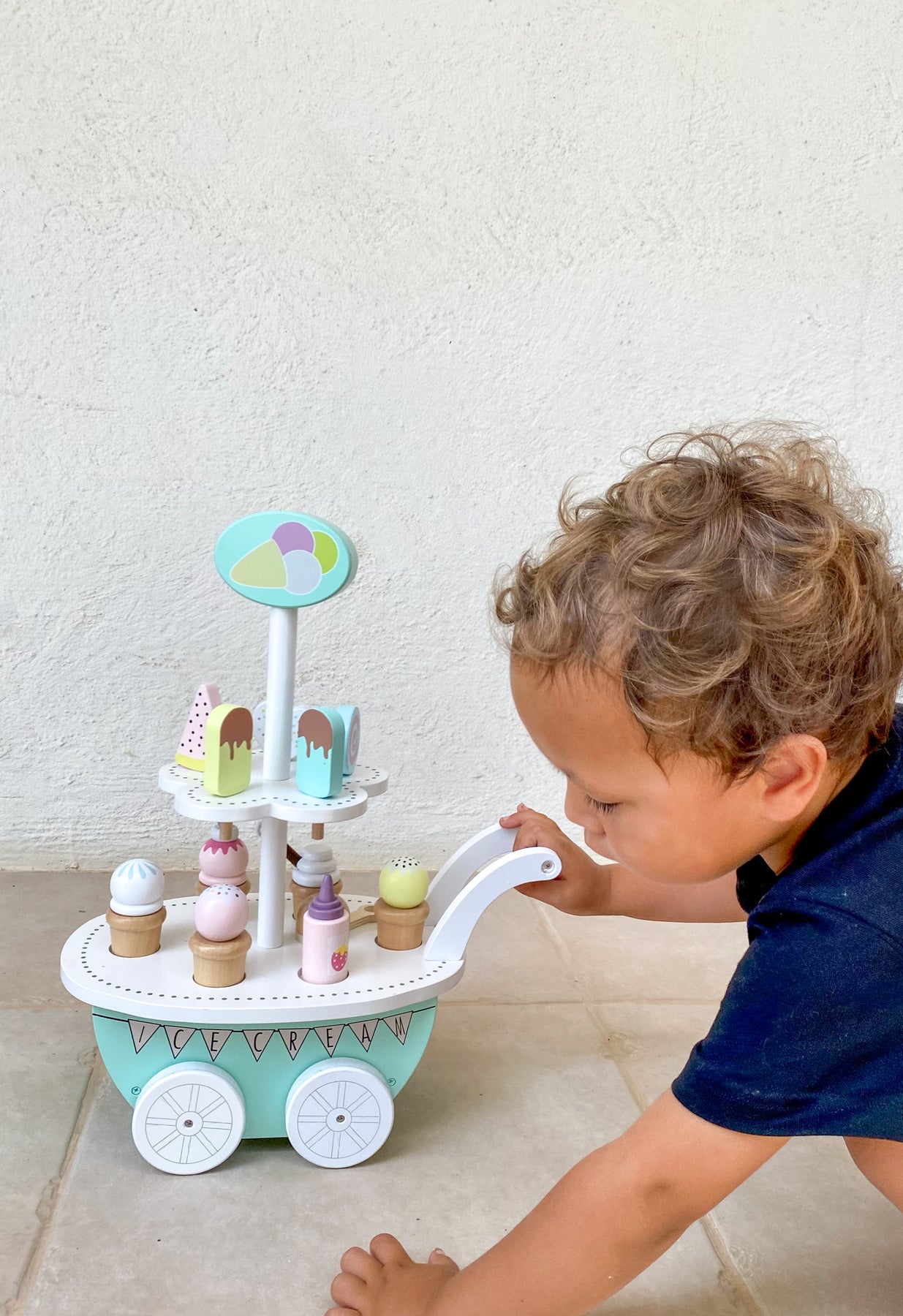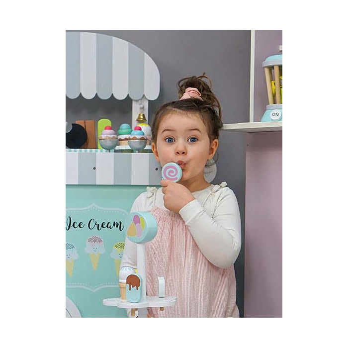 Everybody loves ice cream! With our gorgeous ice cream trolley, you are all set to open your own ice cream bar. The table sized ice cream cart has wheels, so you can drive it around. The cute stand is loaded with 5 ice cream cones with stackable pieces, 5 popsicles, one ice cream scoop and one strawberry topping. The ice cream set is perfectly sized for little hands and encourages creativity, imagination, and role play.