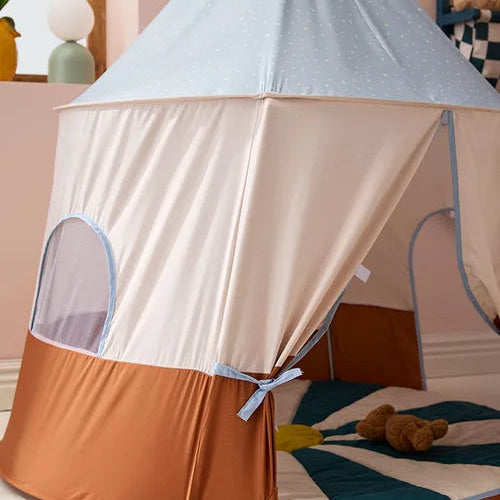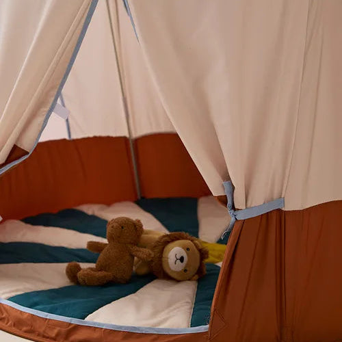Every child deserves a cosy hideaway to call their own—this pop‑up Circus play tent brings that special spot to life. The Play Tent unfolds into shape in a single motion: release it from its folded state and it springs up effortlessly. Some poles need to be slotted into place, but no tools are required. The walls lean gently inwards, creating a snuggly cozy feel, similar to a circus tent. Even if the tent looks playful , the colours are chosen so the tent can be placed in any room and look beautiful and harmonious. Made from soft‑touch polyester in solid, coordinated block colours with a dot patterned roof , this tent offers a clean and harmonious look. Can be cleaned by using a damp cloth. Once playtime’s over, it neatly zips away into its carry bag—ideal for storage or travel. Designed for children aged 2 and up, it’s made for bedrooms, playrooms, livingrooms or temporarily sheltered outdoor, used on a smooth surface. Can not be stored nor kept outdoors. Keep away for any heat source such as radioators or open fire Feature Highlights Effortless pop‑up assembly: simply release the folded tent and lock in the poles—no tools needed. Block‑coloured polyester fabric: coordinated solid panels for a sleek and stylish appearance. Compact carry bag included: zips down for travel or storage