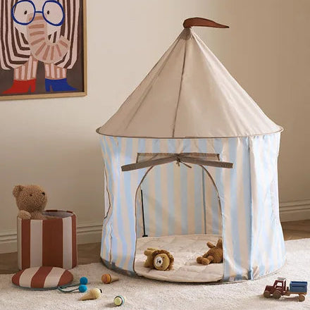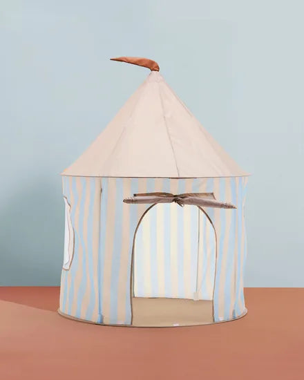 The play tent offers a quiet nook for play, reading, or winding down. Its pop-up style design makes it quick to set up: just insert the poles inside and it takes shape in minutes. The tent includes a sewn-in fabric base and is intended for indoor use. With its calm blue and beige stripes and almost golden coloured roof top it can be a cozy spot for any kids Made from polyester fabric it’s built to handle everyday play. Move it from room to room, use it as a playhouse or a cosy reading spot—this is a flexible space, made for children’s changing needs and ideas. Pile up with cushions or a play mat for extra comfort and coziness Feature Highlights Pop-up style assembly: insert the poles and the tent takes shape quickly—no tools needed. Includes a fabric base: provides a soft foundation and helps define the space. Invites roleplay and rest: works as a calm retreat, playhouse or story corner. Note, the fabric is not treated with flame retardants, as such chemicals are not approved under current REACH regulations. Make sure that the tent is never placed near a heat source of any kind or open fire.
