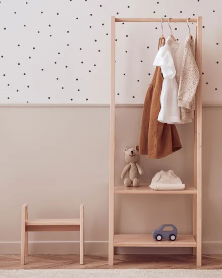 Clothes hanger in FSC certified wood in light beech in the SAGA range. With pole, two shelves, and two hooks on the side. Hangers in the same range available separately. 47x35x125 cm. Maximum weight 50 kg. Suitable for children aged 3-8.
