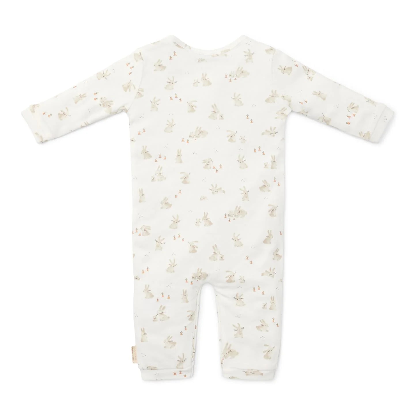For newborn babies, this romper made of wonderfully soft organic cotton is ideal. You don't have to put it over your baby's head. You can lay your baby in the romper and then fasten it with the snap buttons. The off-white romper features cute bunnies. The romper has tags with the Little Dutch logo and the carrot icon.