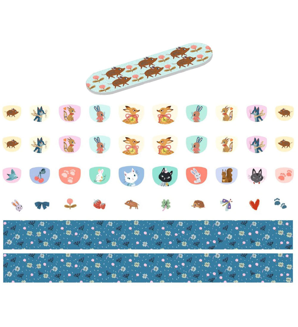 Lovely Djeco nail kit consisting of a total of 60 nail stickers in different colours and flower designs as well as two nail files in purple with an all-over flower print.