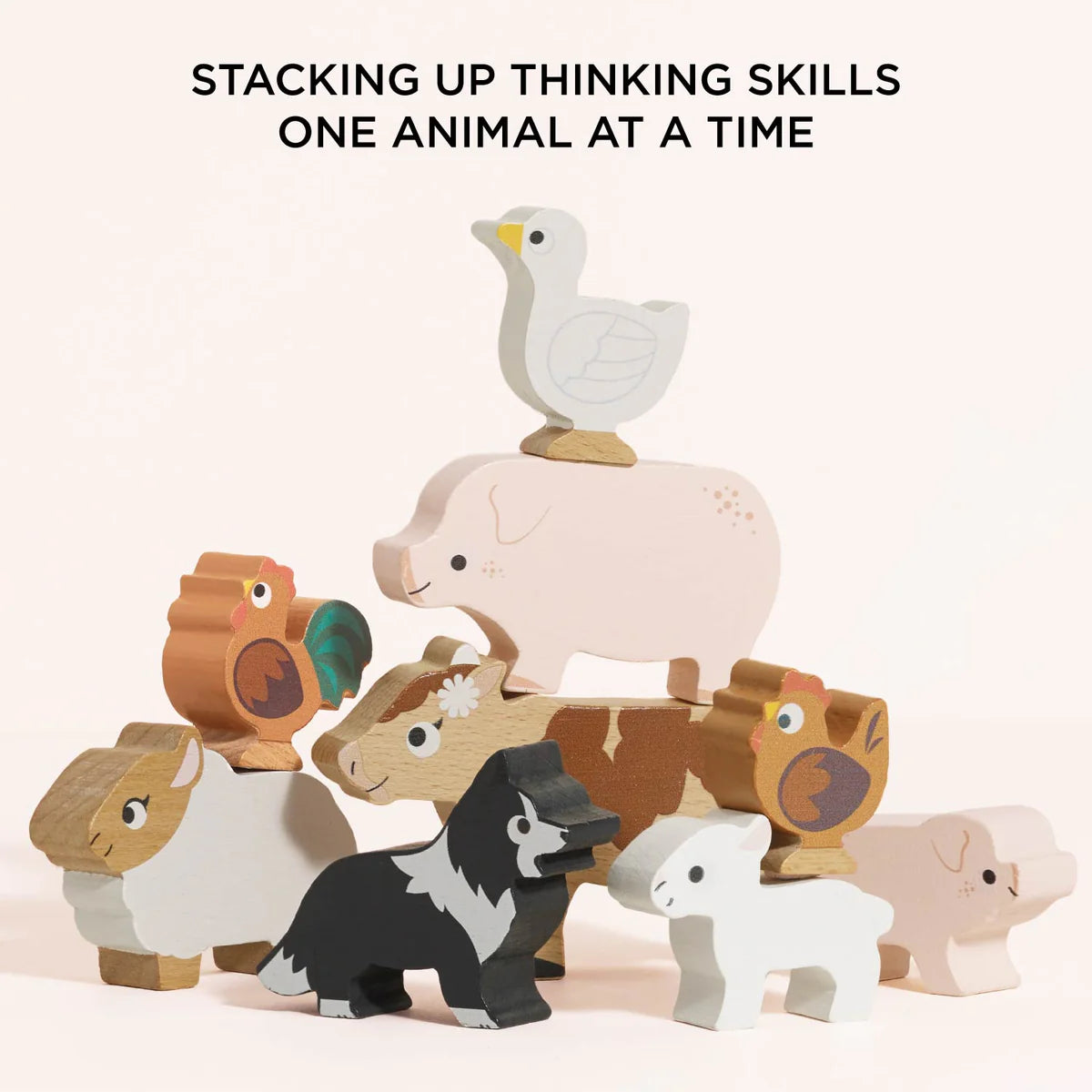 Farmyard fun awaits with this wonderful animal stacking toy, the perfect educational gift for young learners. Comprising nine beautifully crafted animal pieces made from durable FSC® - certified wood, this eco-friendly toy is sure to become a playtime favourite. Each stackable character features a lovely painted design, using water based, child-safe colours and includes all their farmyard favourites, pig, piglet, cow, hen, chicken, sheep, lamb, dog, and a duck. There’s even a handy cotton drawstring bag to keep them safe when not in use. A great toy for developing open ended play.