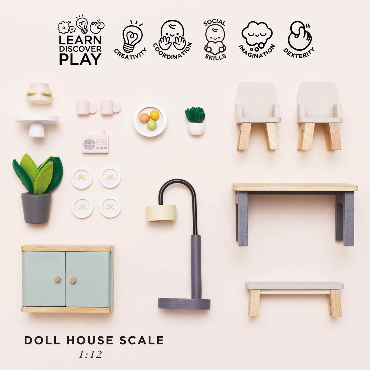 Feast your eyes on this stunning toy dining room set, the perfect addition to add a touch of modern elegance to any home of miniature. Stylish and sustainable, this 18 piece set is made from FSC® - certified wood and features; a smart wooden table with two coordinating chairs plus a bench, a free standing lamp, sideboard, 2 pot plants with realistic felt leaves, a fruit bowl complete with wooden fruit, a radio and, to top it all off, 4 dinner plates, cups and a showstopper cake arranged on a stand – the perfect table centerpiece to tempt little dinner guests. This sweet set is compatible with our full range of stunning dolls houses.